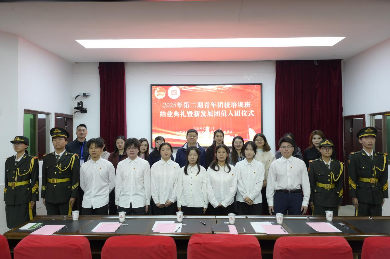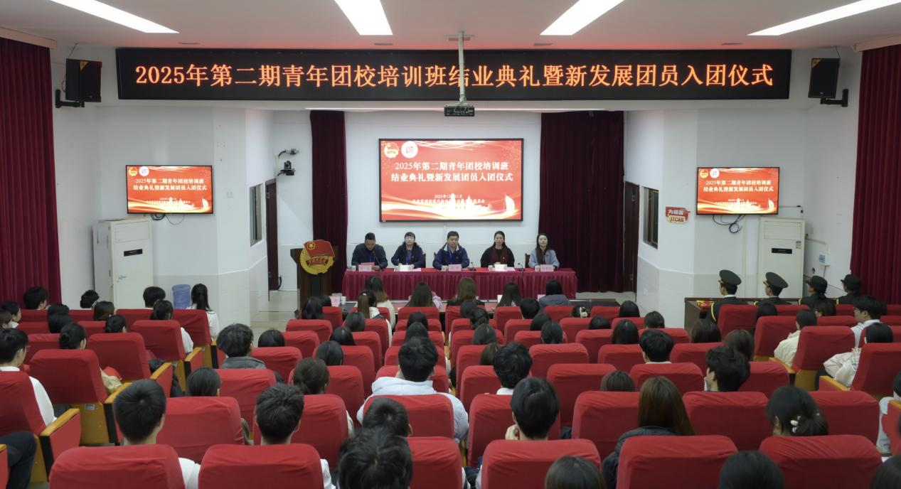 12月11日中午,我校2025年第二期青年团校培训班结业典礼暨新发展团员入团仪式在图书馆一楼学术报告厅隆重举行。校党委委员、副校长肖勇,校团委书记唐鹰尼,校团委兼职副书记毕静明、童梦晨,校团委干事李鑫、胡筠,各二级学院团总支书记及本期团校结业学员齐聚现场,共同见证青年学子赓续青春使命、奔赴成长新征程。