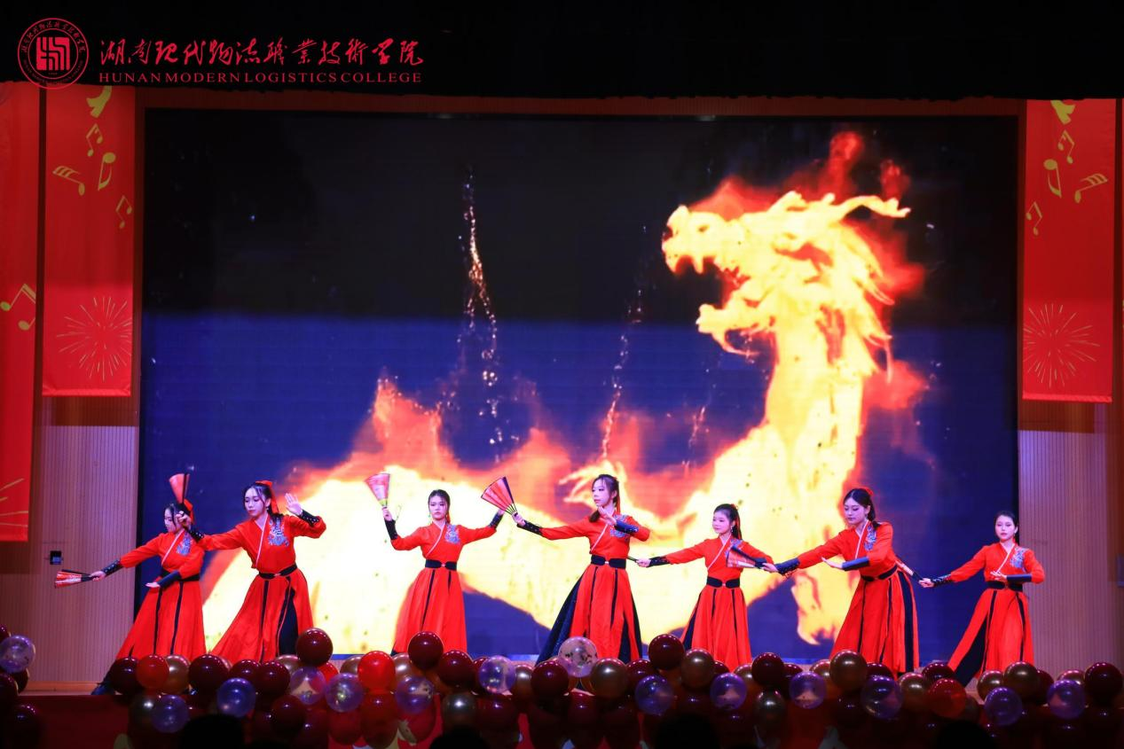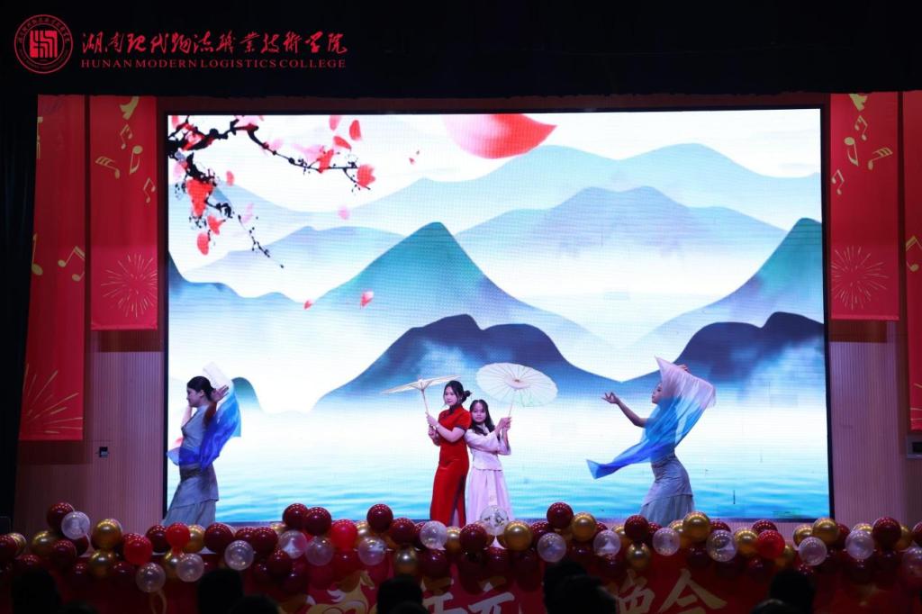 第三篇章“新元启序·共赴荣光”凝聚奋进力量。声乐艺术协会合唱《少年向荣光》,歌声嘹亮、意气风发,传递出少年当有为的赤诚;团委舞蹈《飞天·踏云》惊艳亮相,敦煌舞的飘逸灵动与藏族舞的豪迈奔放完美交融,尽显中华多民族文化魅力,赢得满堂喝彩;工会选送的师生朗诵《诗词里的中国》声情并茂,带领师生在诗词长河中感悟中华文脉;最后,物流信息学院师生带来《相亲相爱·共启新元》,温情歌声传递出全校师生同心同行的深厚情谊,晚会在温馨氛围中圆满落幕。