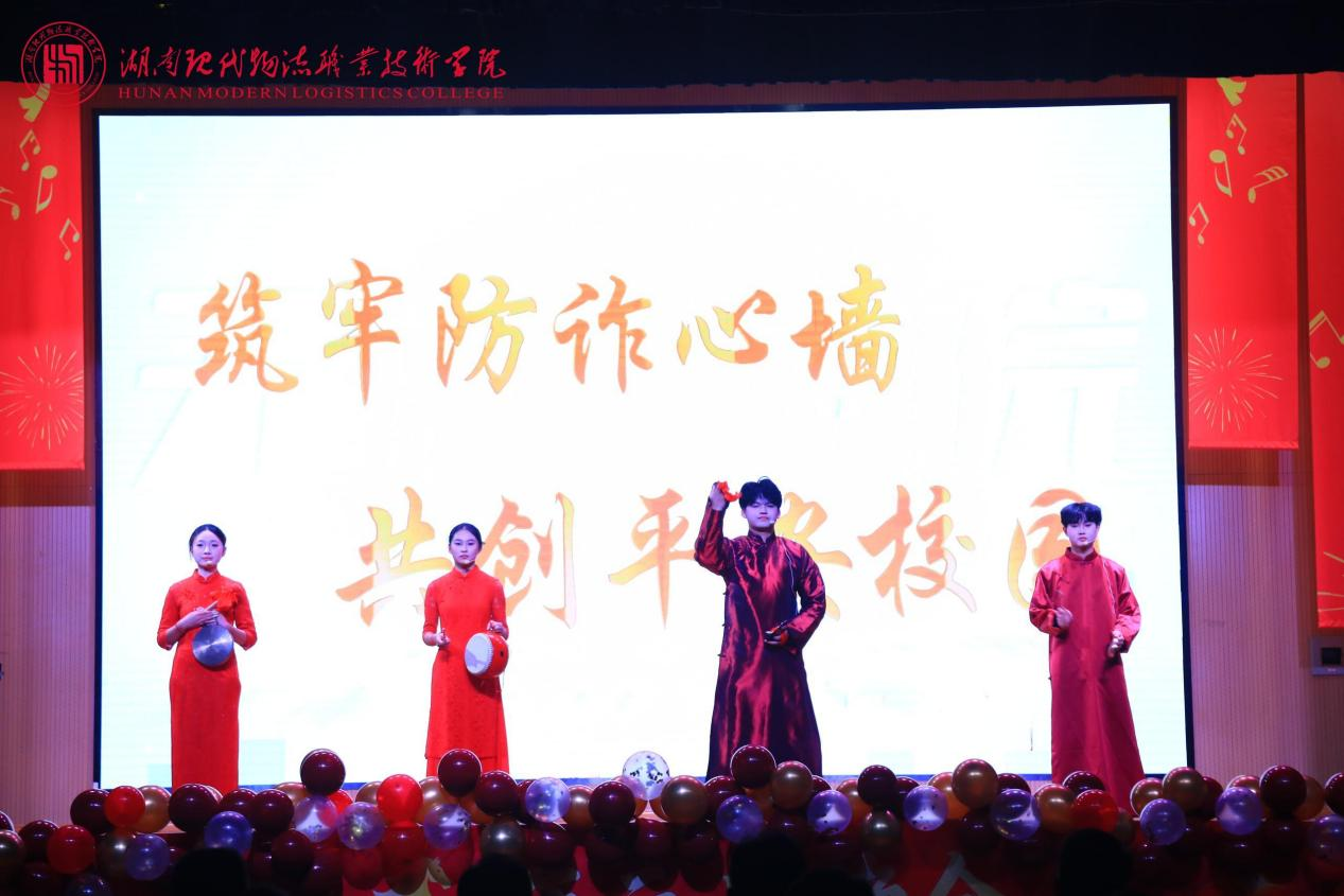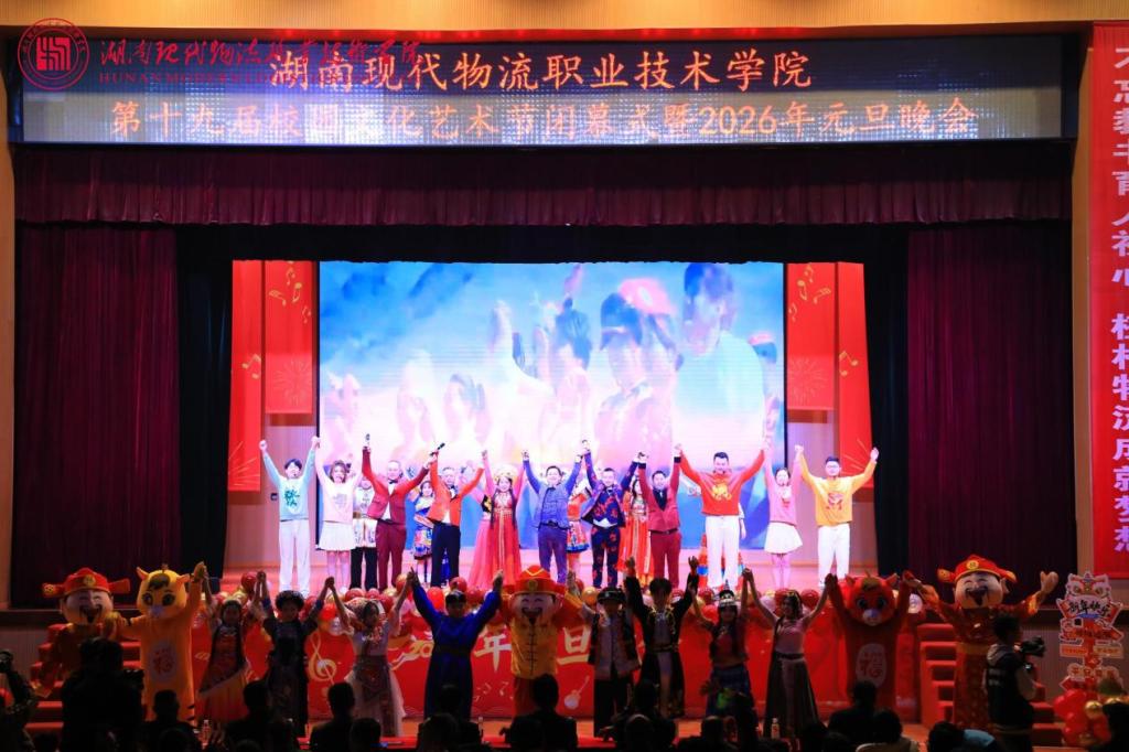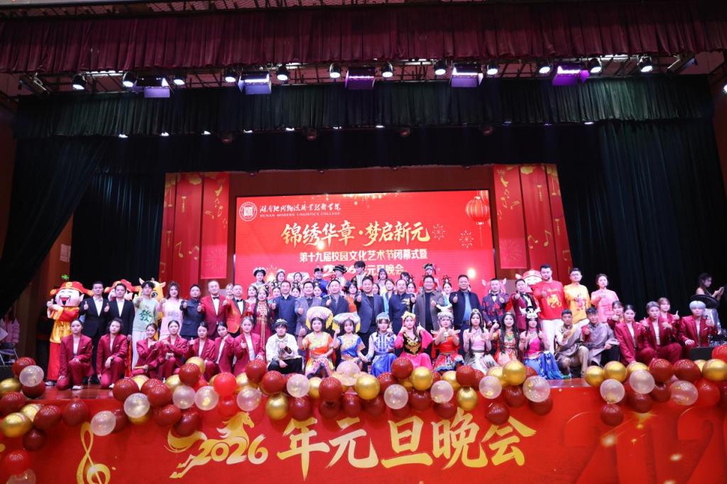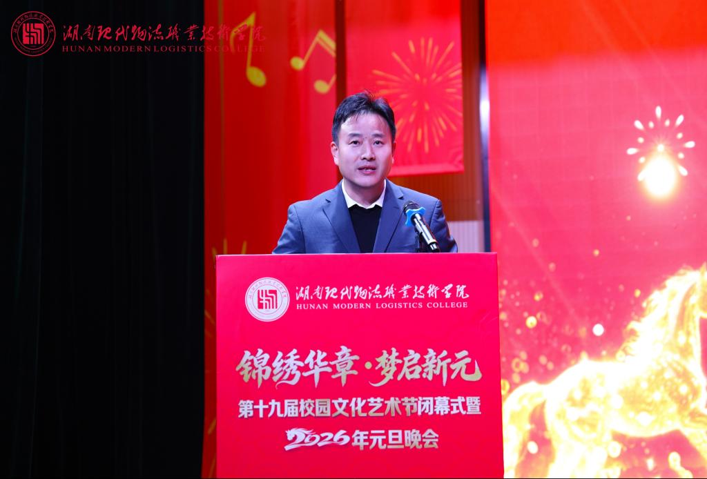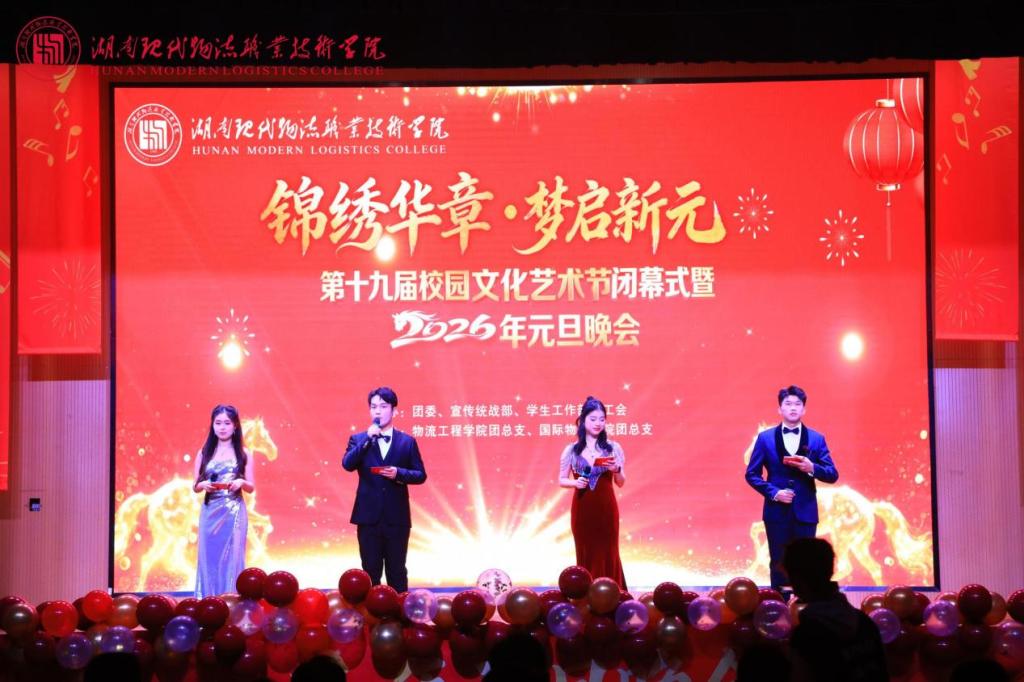 12月30日19:00,我校“锦绣华章 梦启新元”第十九届校园文化艺术节闭幕式暨元旦晚会在体艺馆隆重举行。学校党委书记龙吟,党委副书记邓剑波,党委委员、副校长罗勇,党委委员、纪委书记刘贵书,党委委员、副校长肖勇,党委委员、副校长邢伟,党委委员、组织人事部部长梁飞、正处级干部陈建华以及以及1400余名在校师生齐聚一堂。本次晚会由团委、党委宣传统战部、学生工作部、工会主办,物流工程学院团总支、国际物流学院团总支承办。