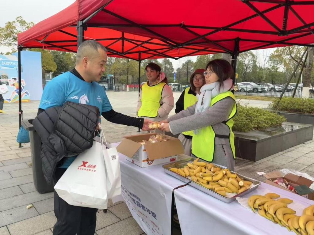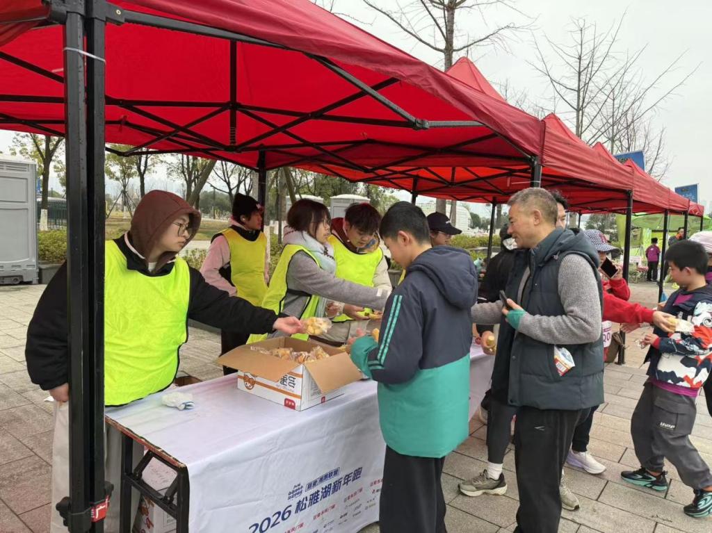 亲子跑终点的11名同学,成了最温暖的“守护者”。他们耐心引导完赛家庭领取纪念物资,遇到年幼的小选手,还会蹲下身轻声安抚情绪,用温柔的话语和亲切的笑容,让亲子跑充满温馨感。补水站的同学们化身“能量传递员”,不仅精准快速地递上补给,还用最响亮的声音为跑者加油:“Fighting!”“加油,坚持住!”“新年快乐!”一句句呐喊驱散了跑者的疲惫,也让寒冷的清晨多了几分暖意。